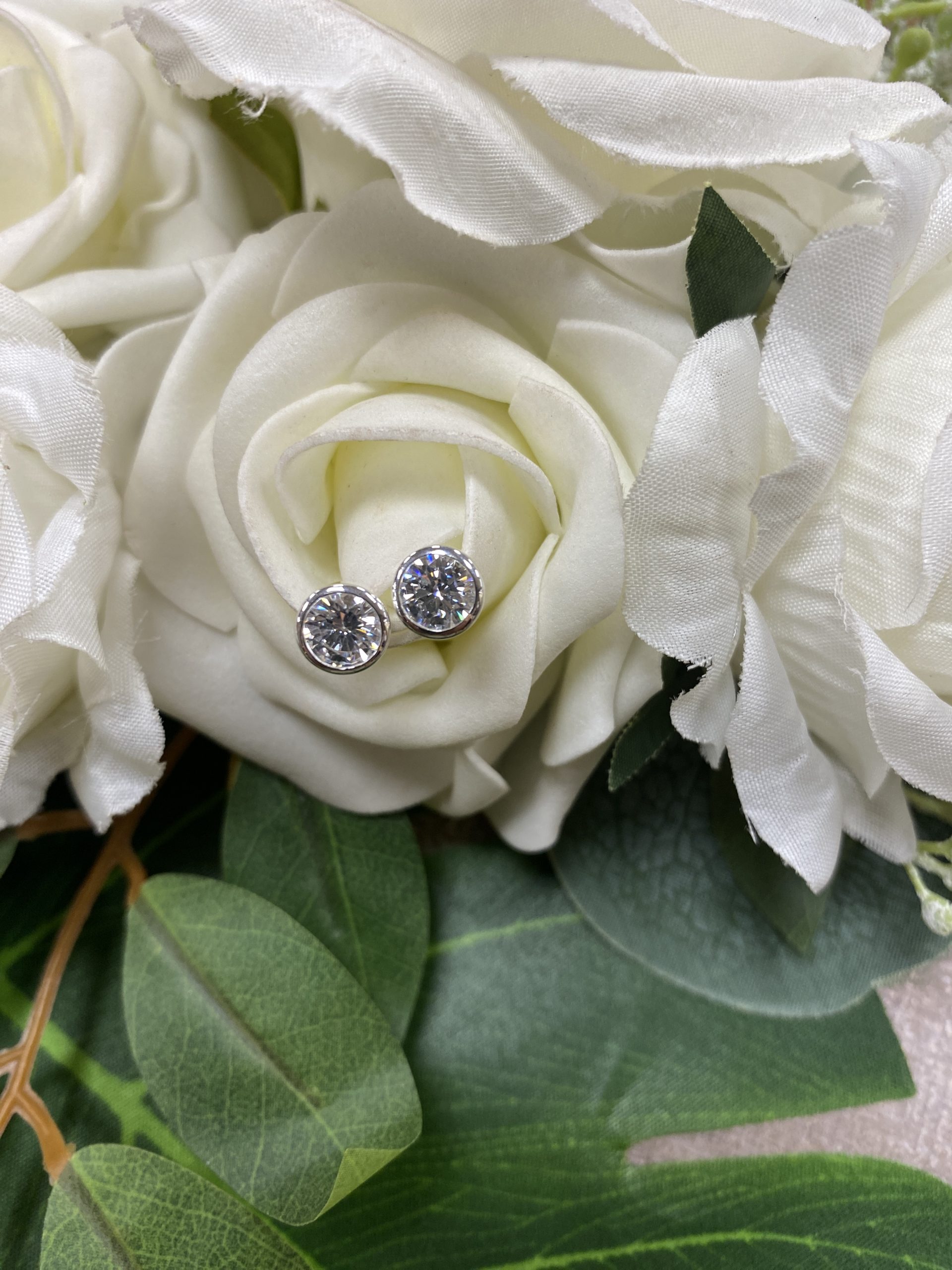 Sparkly cubic zirconia studs in a circular shape. Crafted from sterling silver with an extra layer of silver plate. Earrings measure 7mm.