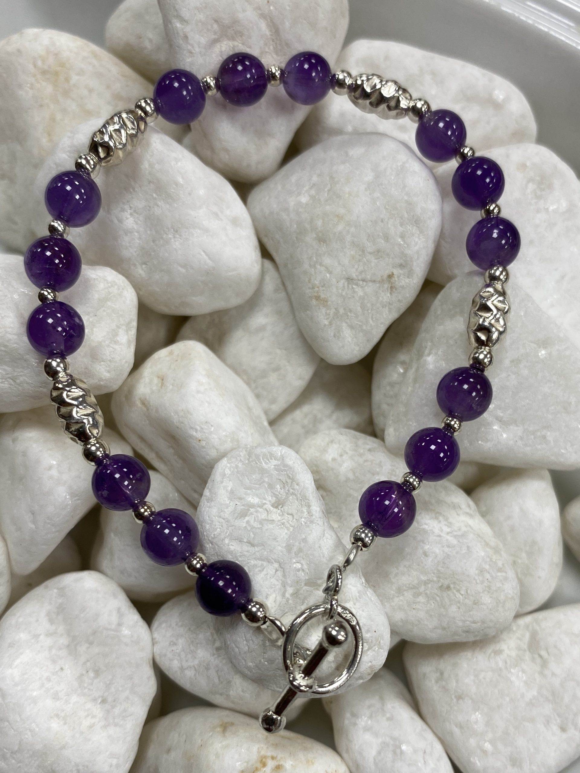 Sterling silver and Amethyst bracelet. The bracelet is made up of round 6mm Amethyst beads and 6mm round silver beads. The bracelet has a sterling silver T-bar fastening. This bracelet is designed, and hand made on the premises. All our silver jewellery comes in beautiful presentation boxes.