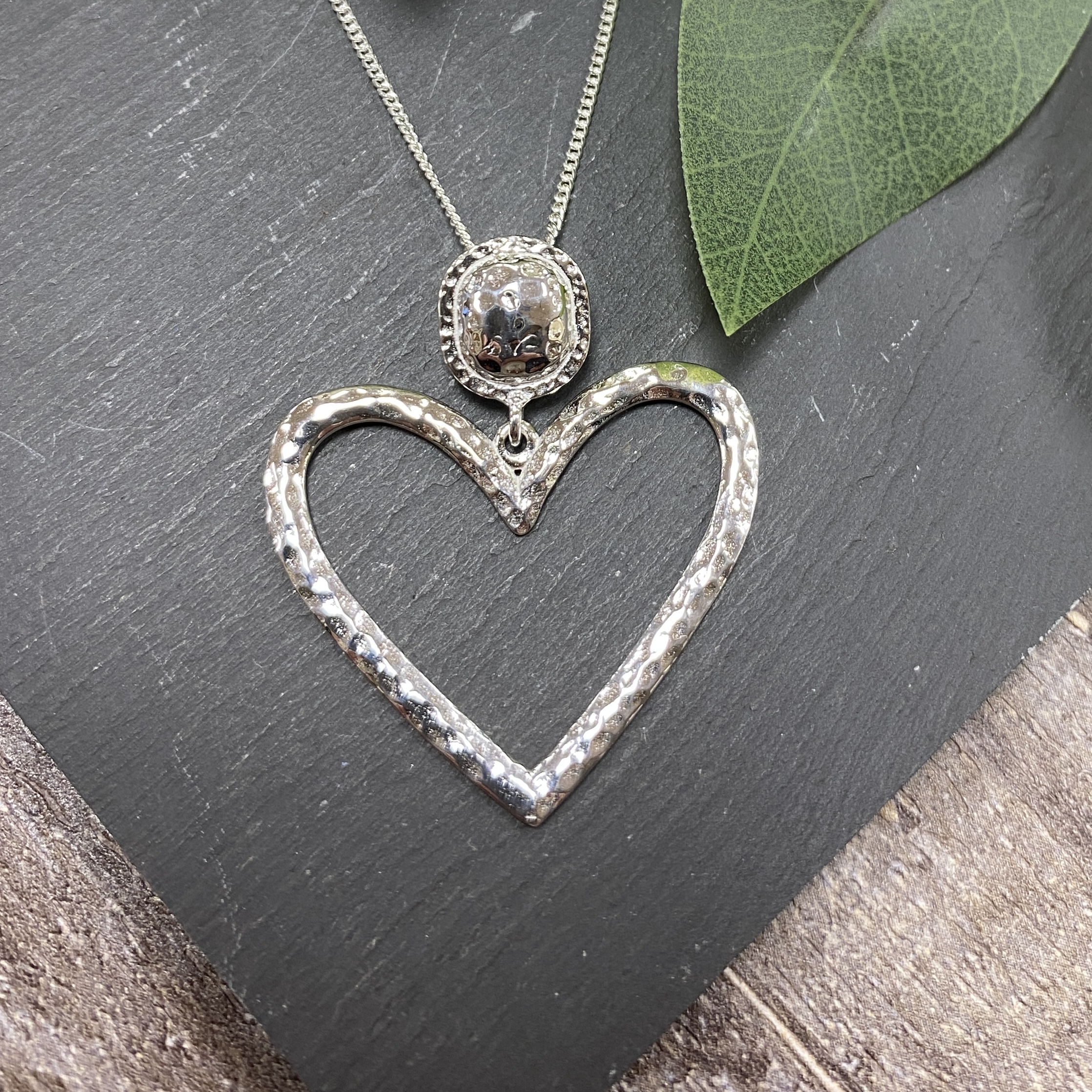 Elegant open heart shape pendant displaying an eye-catching hammered texture on a silver chain measuring 18 inches.