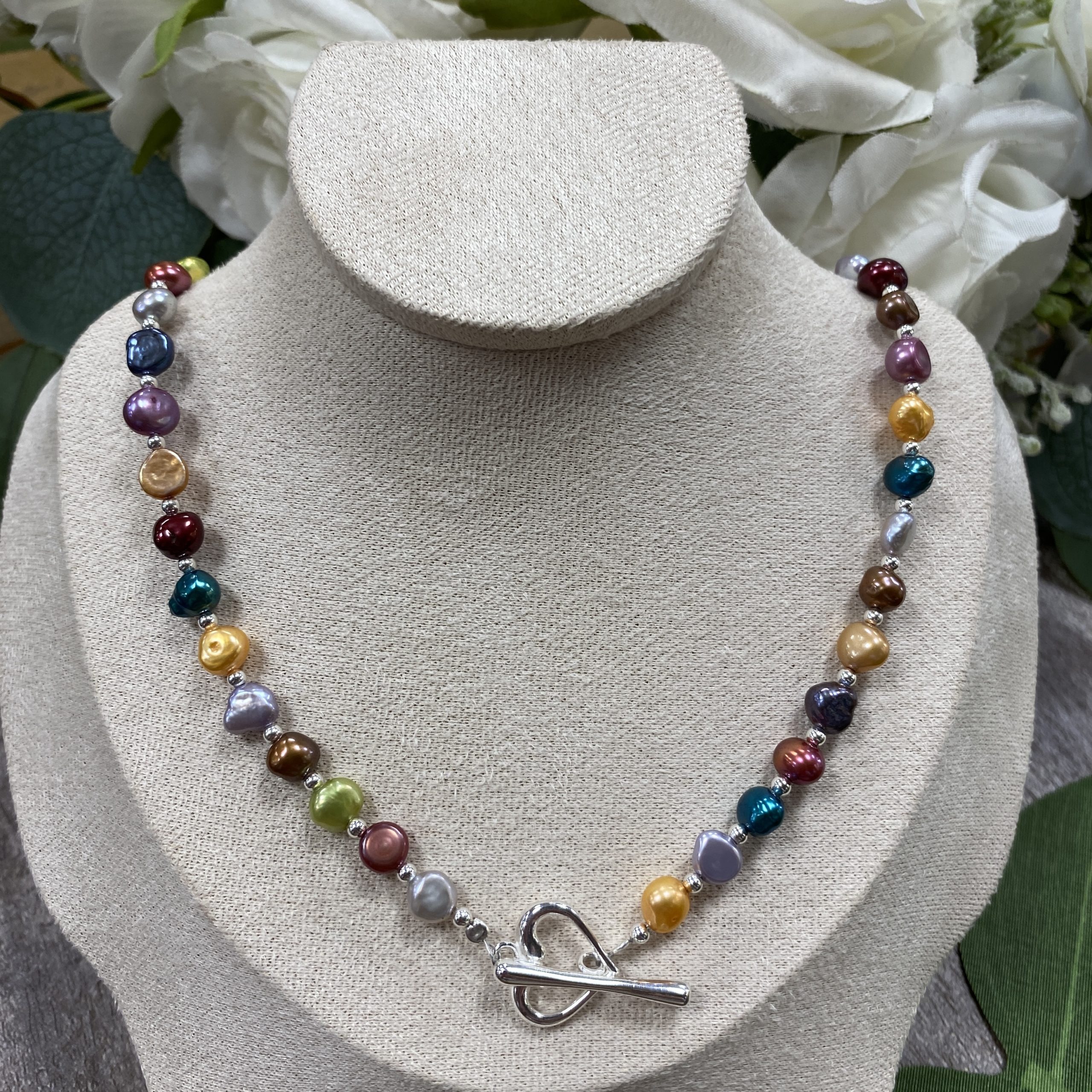 Exquisite multi-coloured pearl necklace, a vibrant piece of jewellery that combines several distinct natural shades of pearls onto a single strand. This versatile necklace moves beyond traditional single-tone strands.