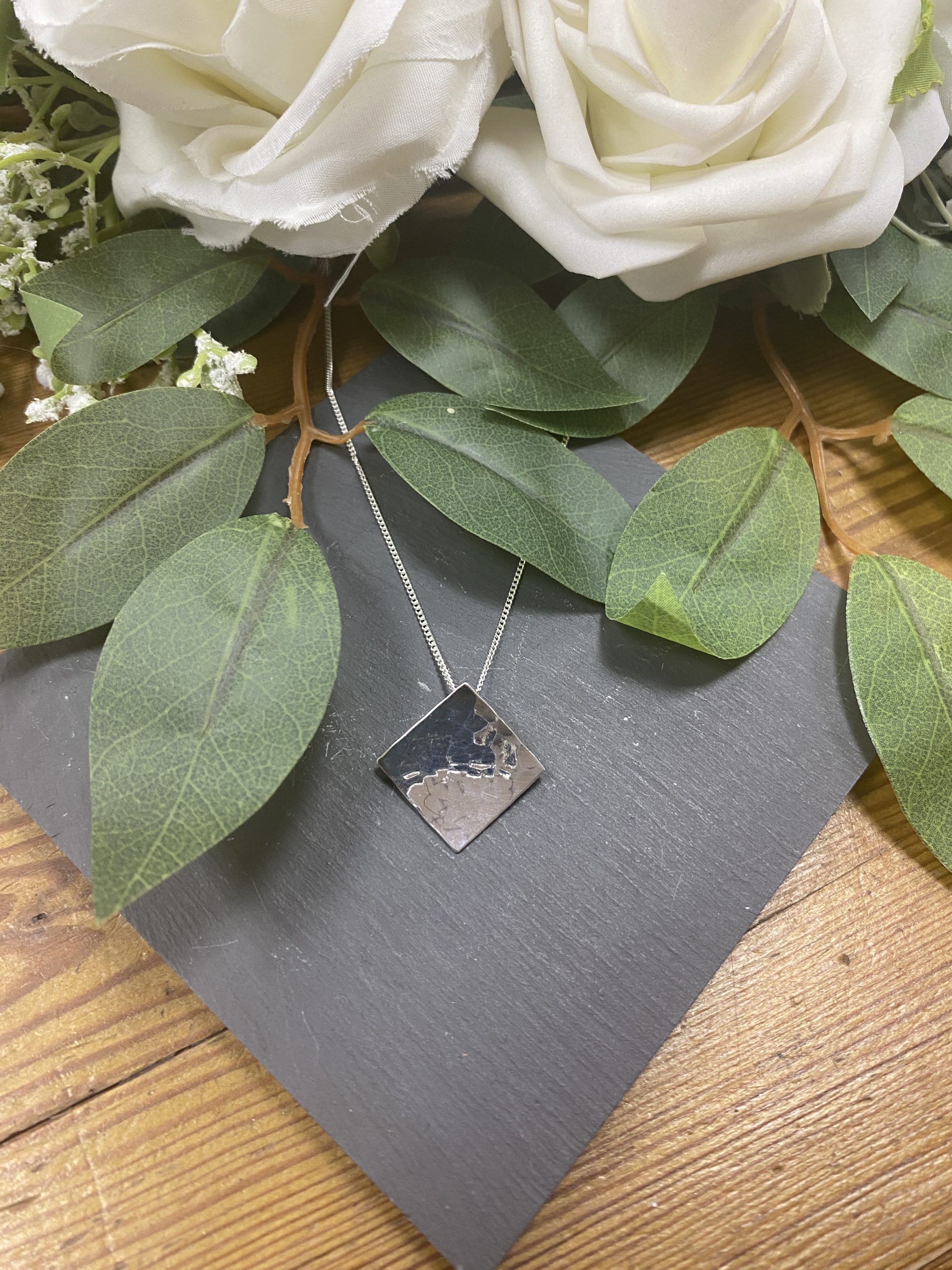 Minimalist sterling silver diamond shaped pendant with hammered effect and subtle concave shape on an 18″ chain. Circle diameter is 20mm.