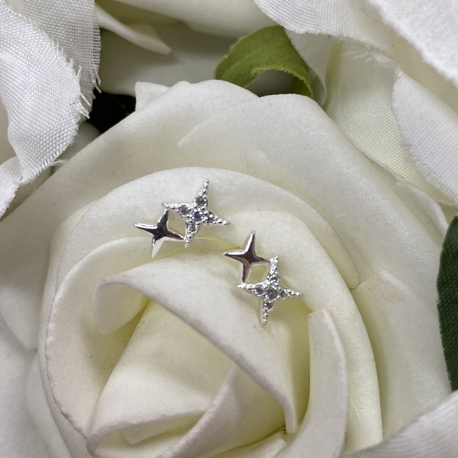 Star studded earring featuring a combination of silver and cubic zirconia.