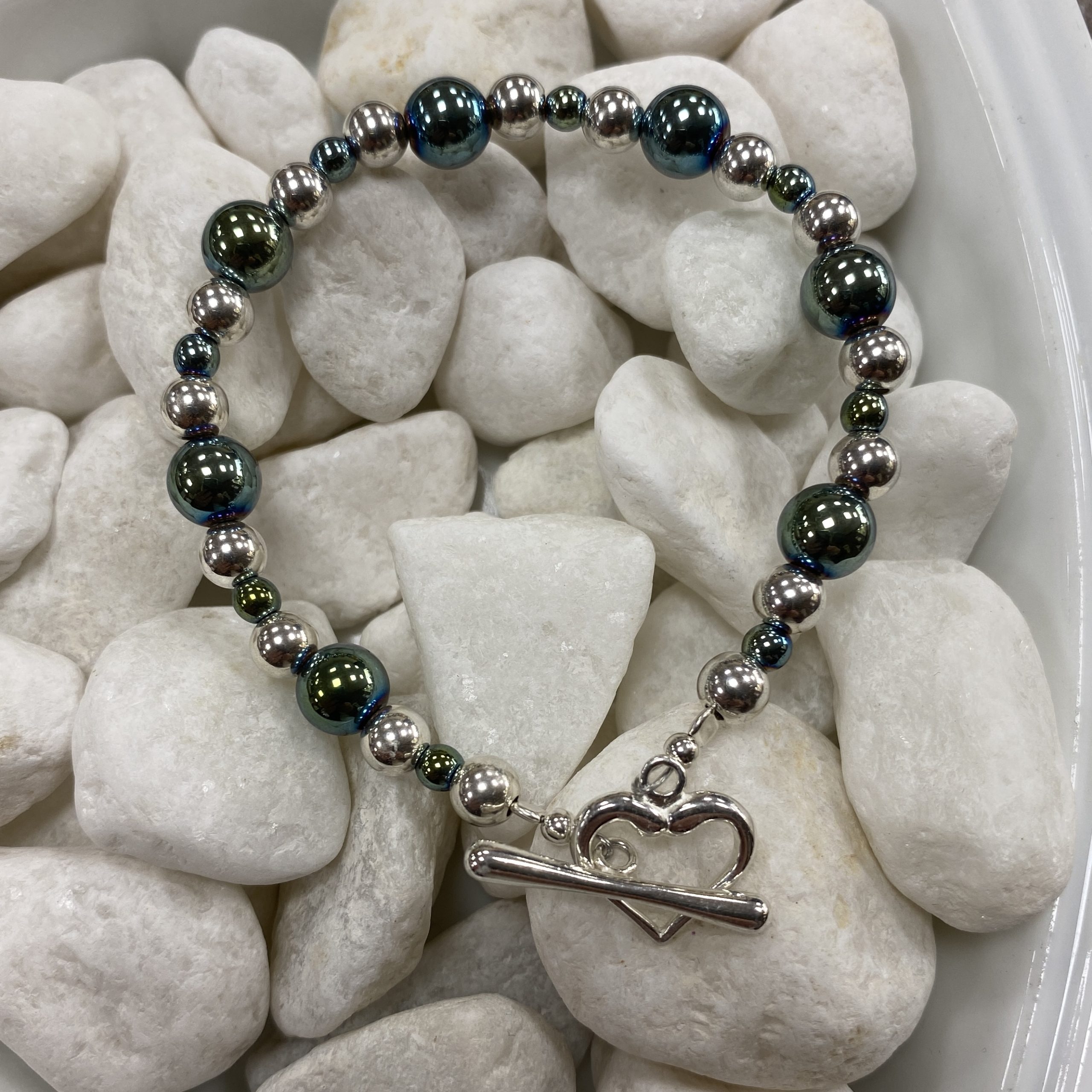 Sterling silver bracelet with 8mm and 3mm green electro plated hematite round beads and 6mm silver round beads. The bracelet has a sterling silver T-bar and heart shaped fastening. This bracelet is designed, and hand made on the premises. All our silver jewellery comes in beautiful presentation boxes.
