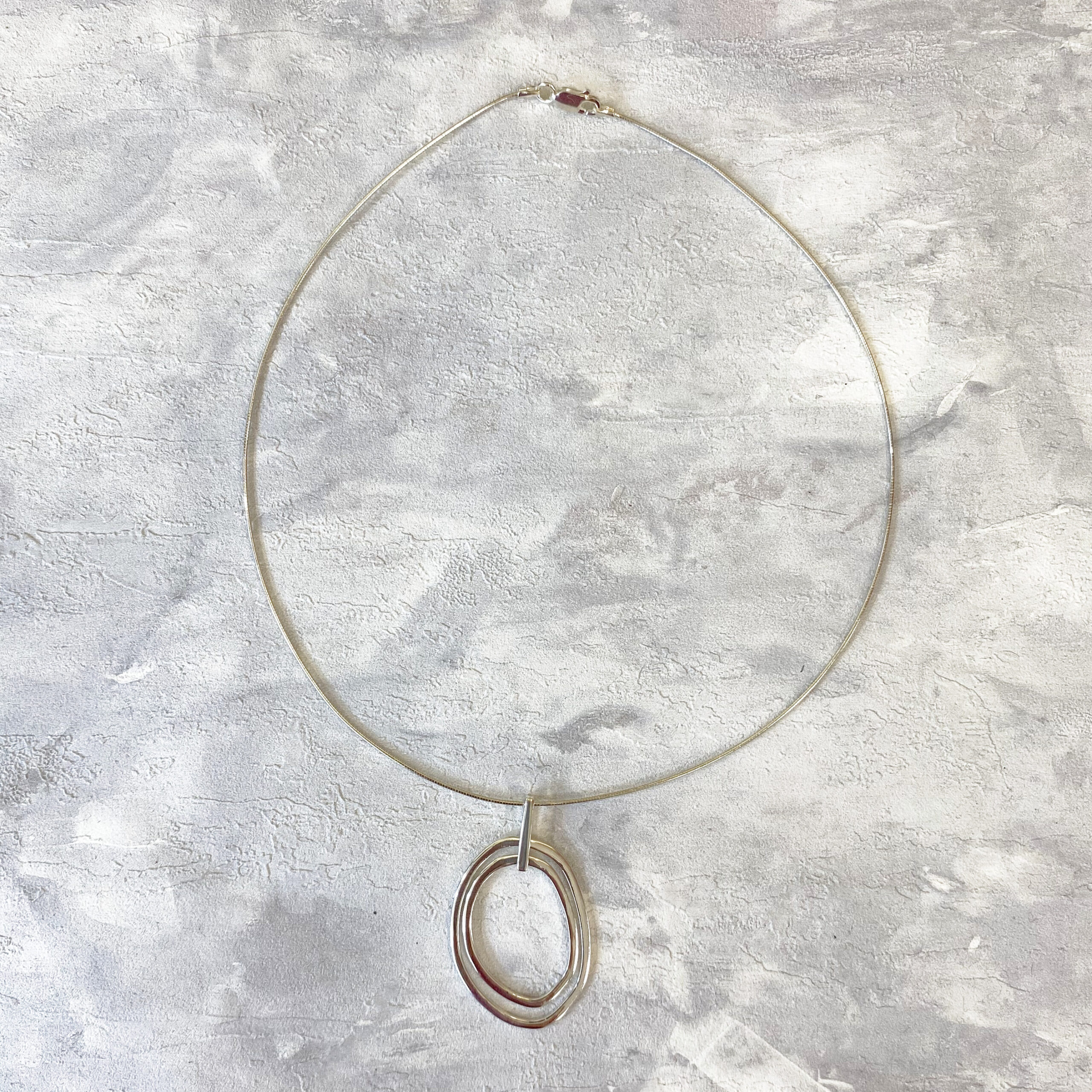Sterling silver open, abstract shaped, double oval pendant on a silver omega chain. The chain is approximately 1mm thickness and 16 inches in length. The ovals are joined separately so both have movement. If you would like more information about this product, please contact us on 01786 446600 or email info@ahdors.co.uk. All our silver jewellery comes in a beautiful presentation box.