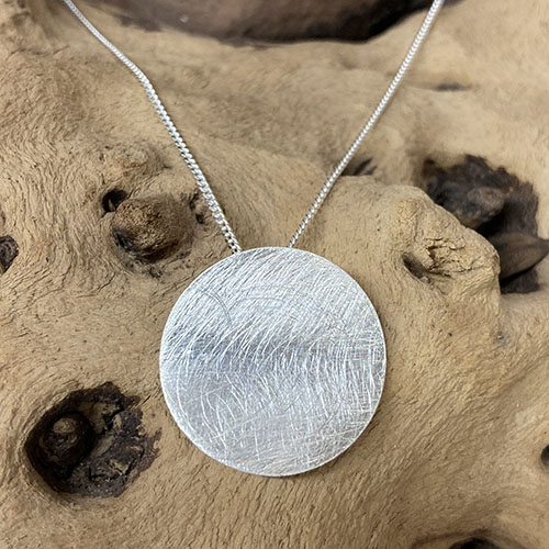 Sterling silver scratched effect round disc pendant on a silver chain measuring 18 inches. If you would like more information about this product, please contact us on 01786 446600 or email info@ahdors.co.uk