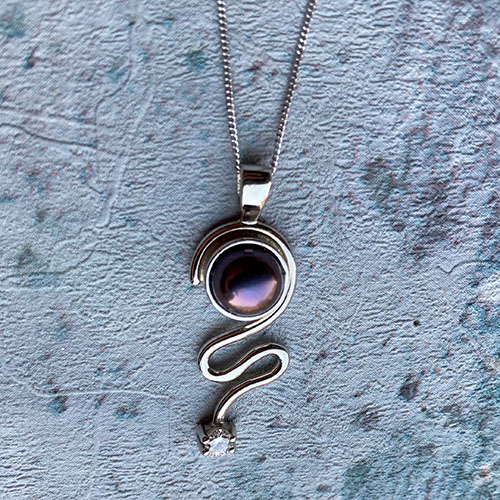 9ct white gold pendant with a pearl in a rub over setting and a 0.18ct round brilliant diamond in a white gold claw setting. The pendant is in on an 18” white gold chain. This pendant is hand made on the premises and can also be made in yellow or rose gold. If you are interested in having a piece of gold jewellery made please contact us on 01786 446600 or email: info@ahdors.co.uk